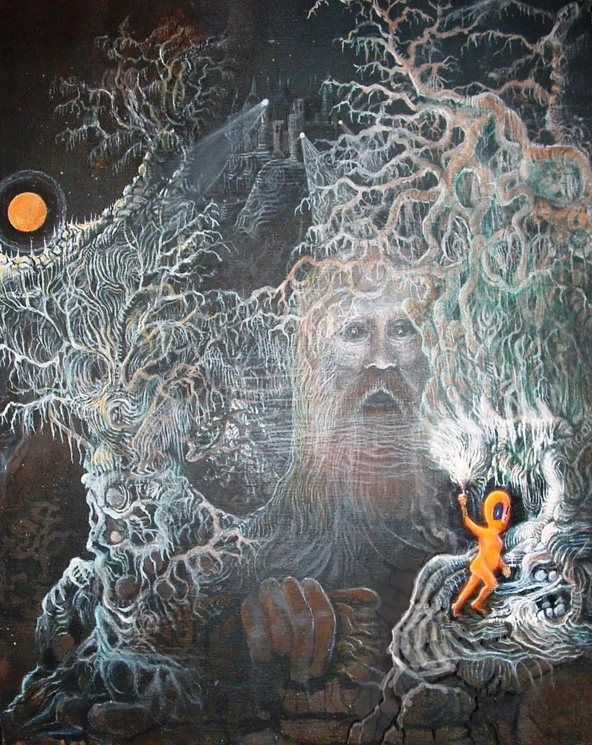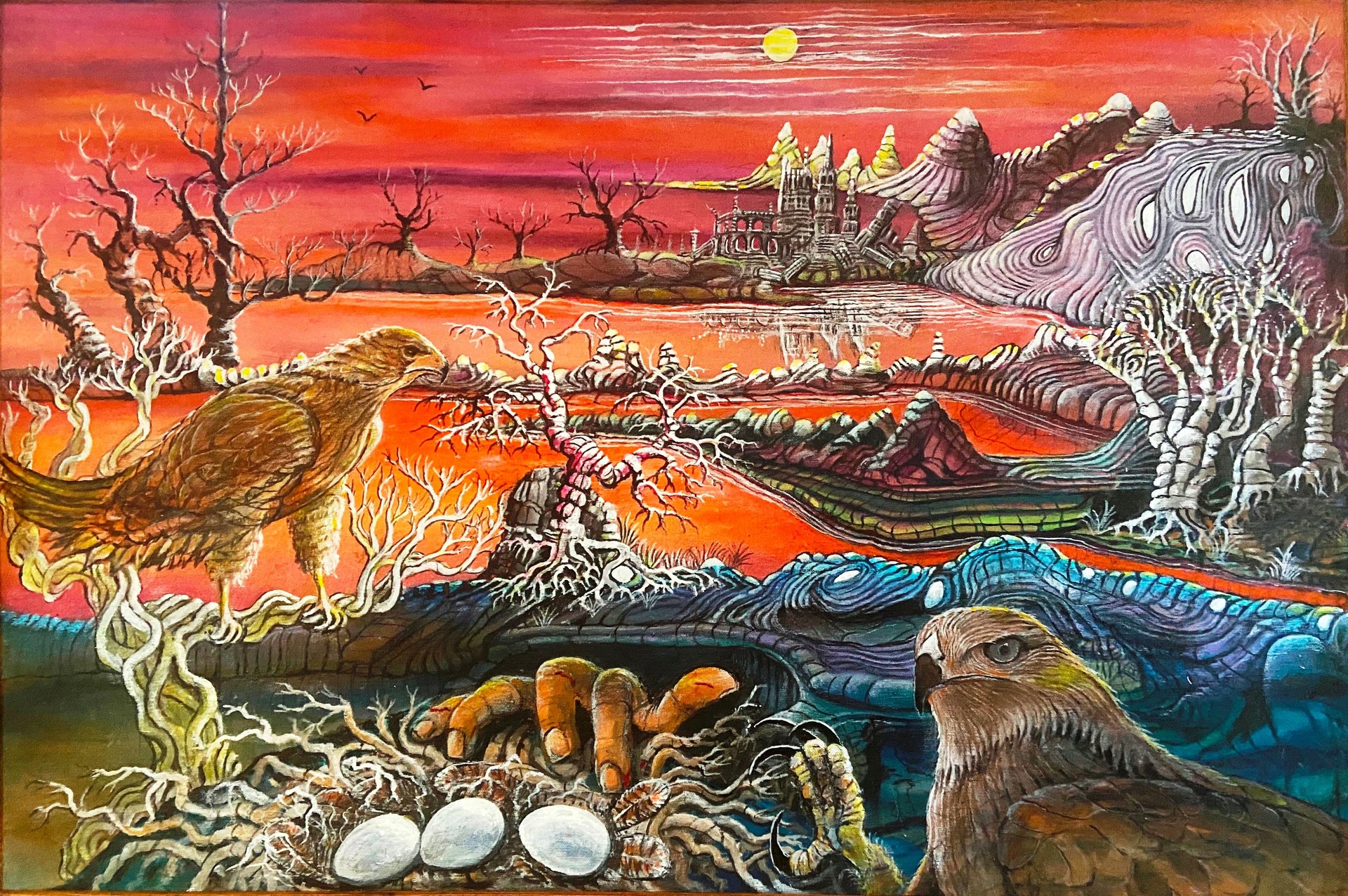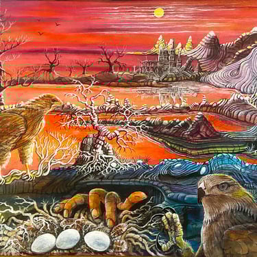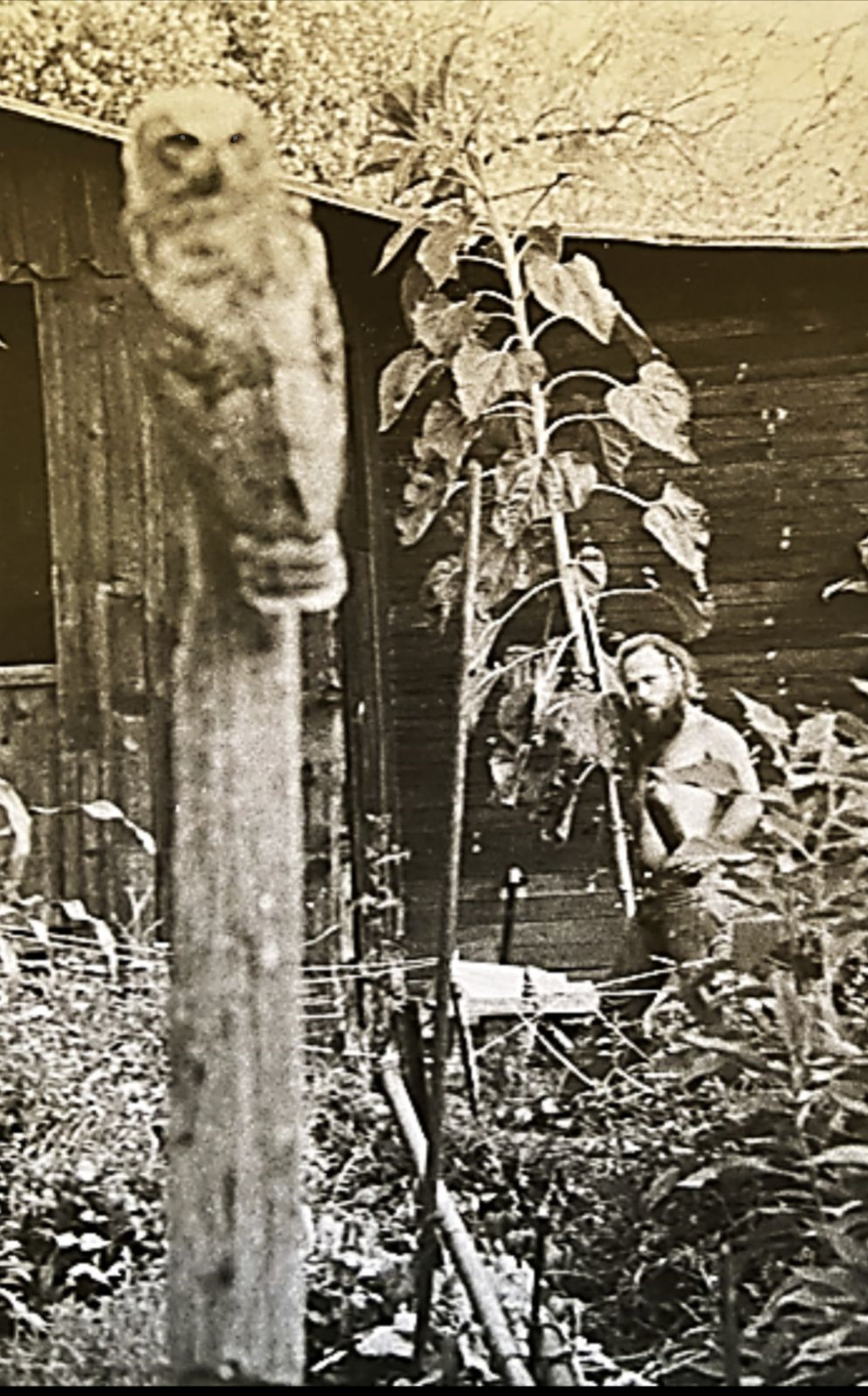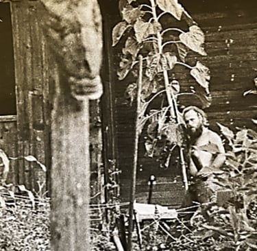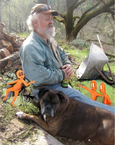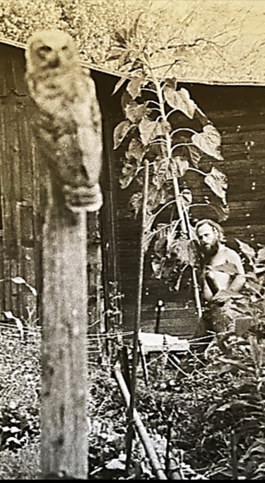 in the remote hills of Northern California. My wife and I built our house without electricity or an access road, which created ‘many exciting and unexpected adventures’. I worked as a carpenter, and later became a water developer specializing in horizontal drilling of spring water sources and in dowsing for deep water supplies for vertical drilling rigs. Our garden was often visited by a large guardian owl, shown in the photo, on the right who is featured in both my art and in this story.